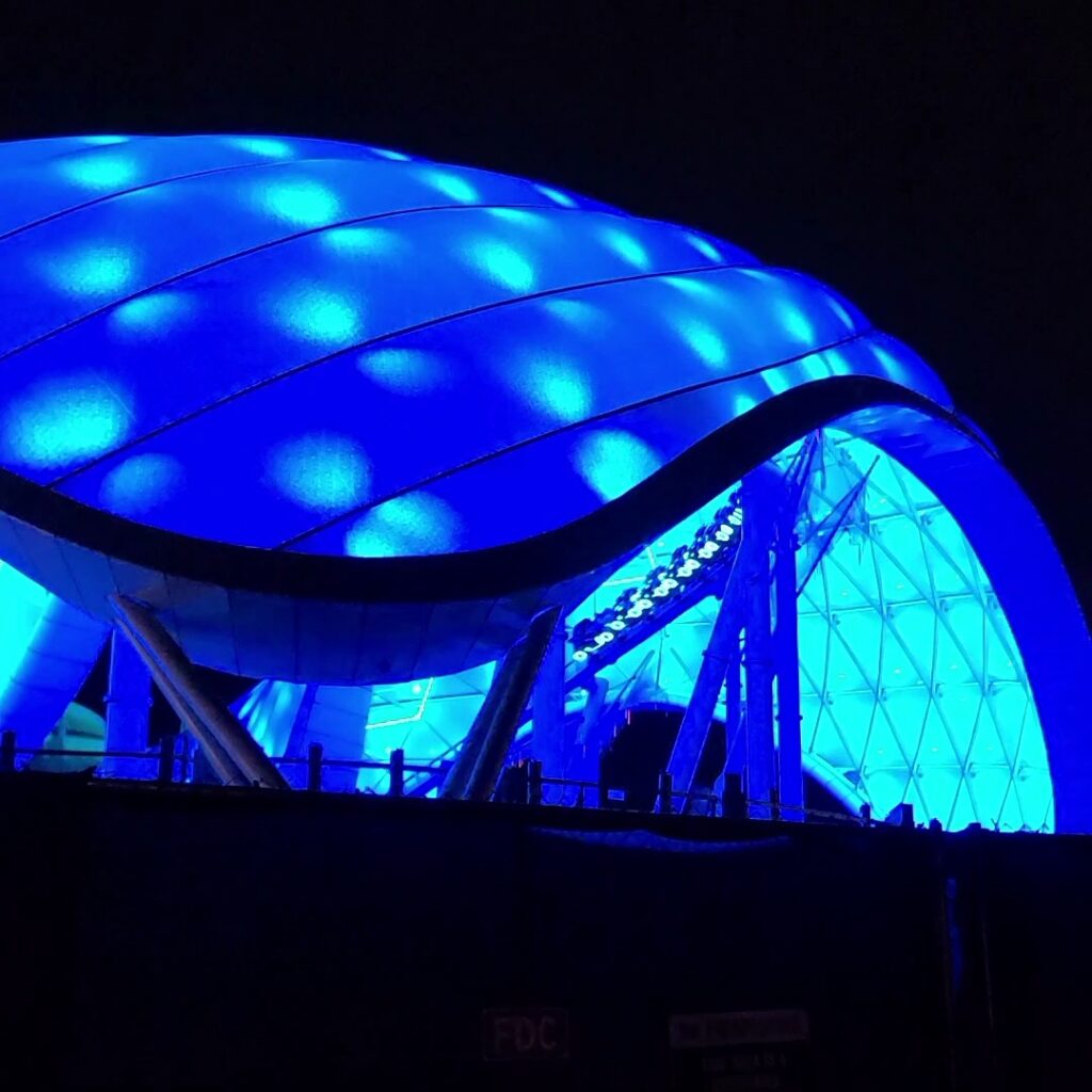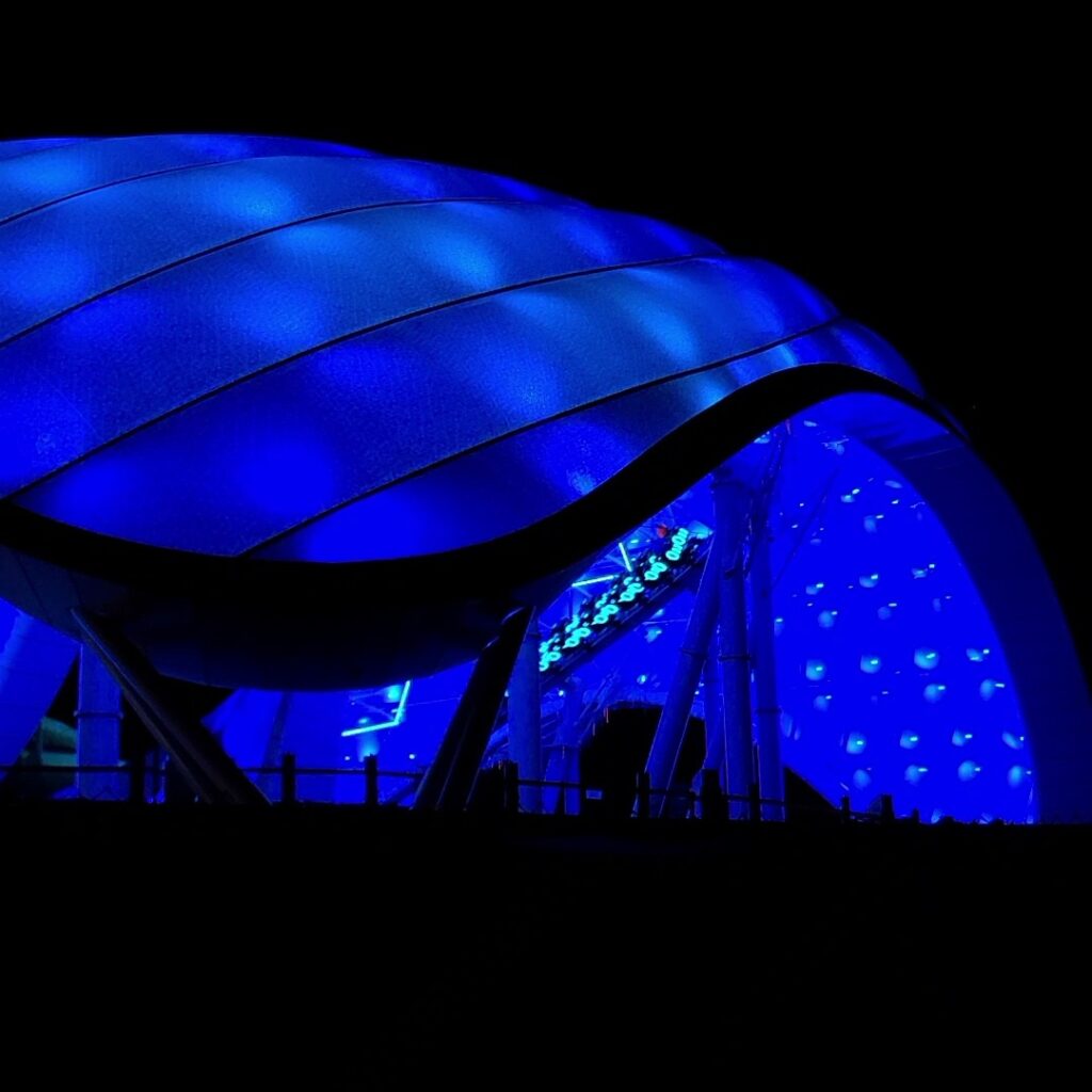 This image we captured depicts a rider seated in the first row of the new roller coaster, as well as the blue-colored, illuminated canopy. Much like Shanghai Disneyland’s TRON Lightcycle Power Run, this canopy will more than likely incorporate additional colors, such as green, purple, and red, once the attraction opens.